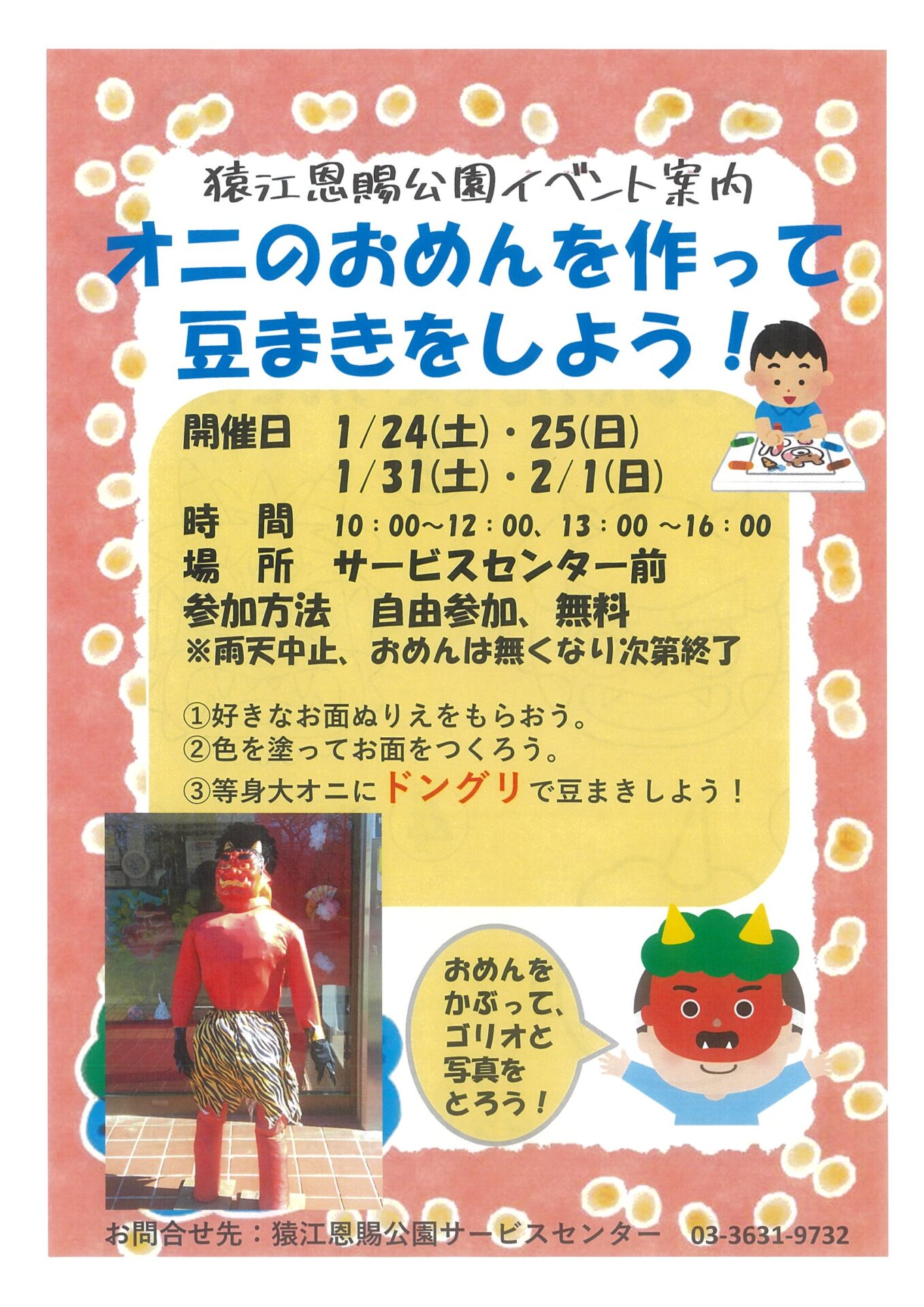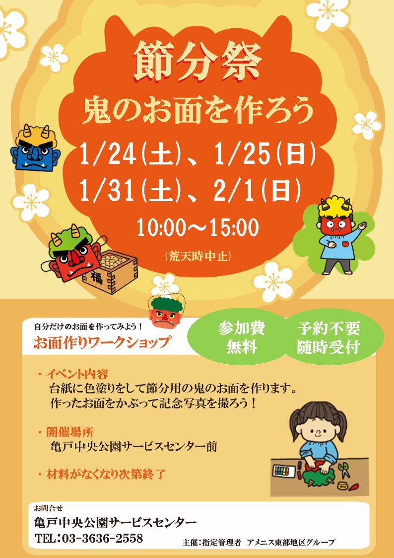 3. 【亀戸中央公園】1/24,25,31、2/1 「鬼のお面を作ろう!」を開催します!