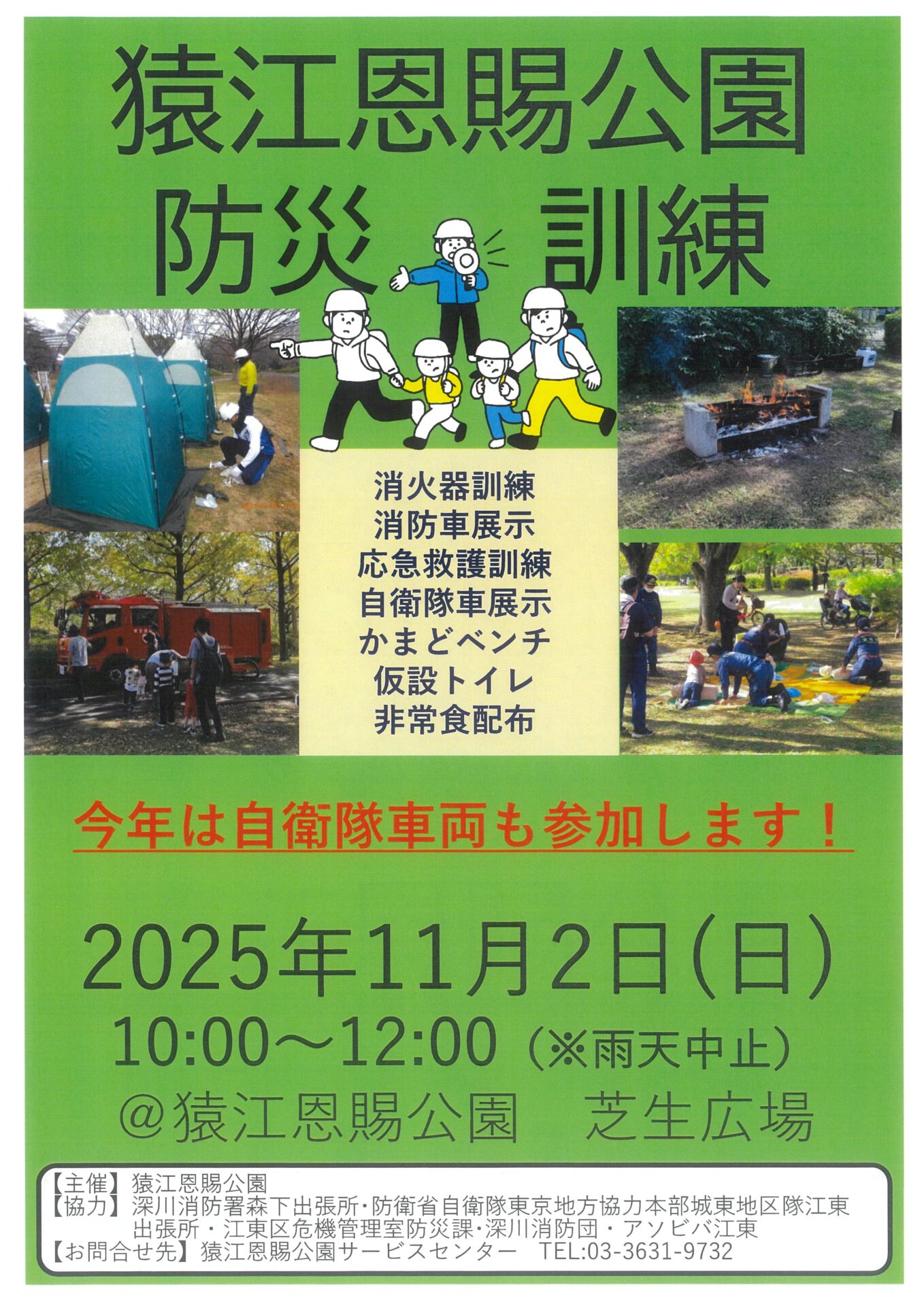 【猿江恩賜公園】防災訓練イベントを実施します。 2025年10月13日 東京都東部7公園 開催日:'25.11.02 - 公園名:猿江恩賜公園 いつも猿江恩賜公園をご利用いただきましてありがとうございます。 園内の防災施設の案内や消防署などの協力による消火訓練などを行います。 日 時 11月2日(日)10時~12時 ※雨天中止 中止の場合は当日8時までにHPに掲載 場 所 北園芝生広場周辺 実施内容 消火器訓練、消防車展示、応急救護訓練、自衛隊車展示 かまどベンチ・防災トイレ展示、非常食配布