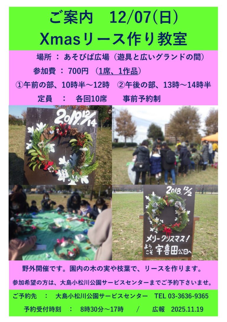 【宇喜田公園】12/7(日)「Xmasリース作り教室」を開催いたします!