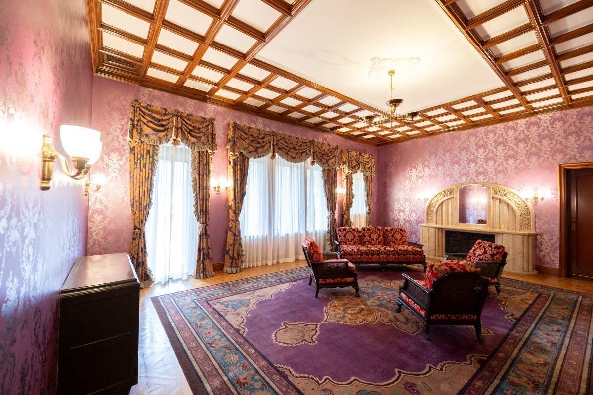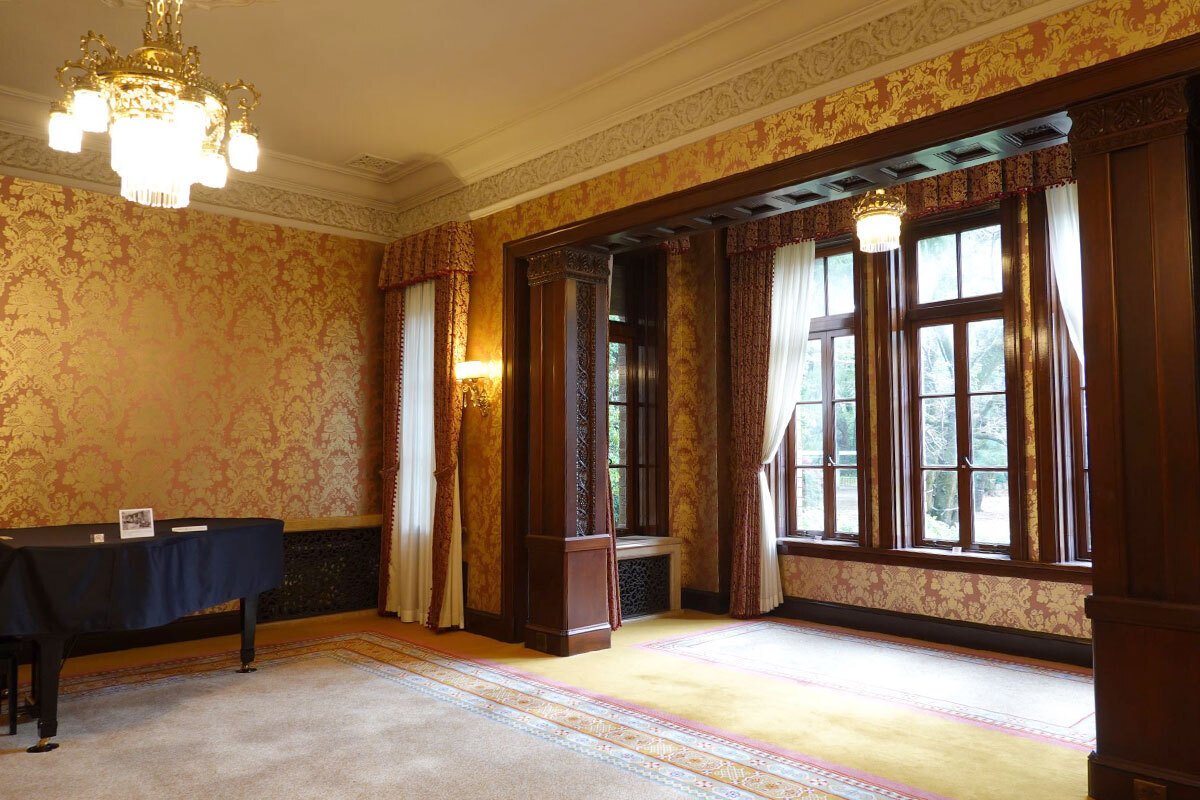 1階は主に、国内外のゲストをおもてなしする私設迎賓館としての役割を持っていて、パーティや式典、晩餐会などが行われました。窓の外には広大な芝生と築山があり、園遊会が行われたほか、家族はスキーや乗馬を楽しんでいたのだそう。