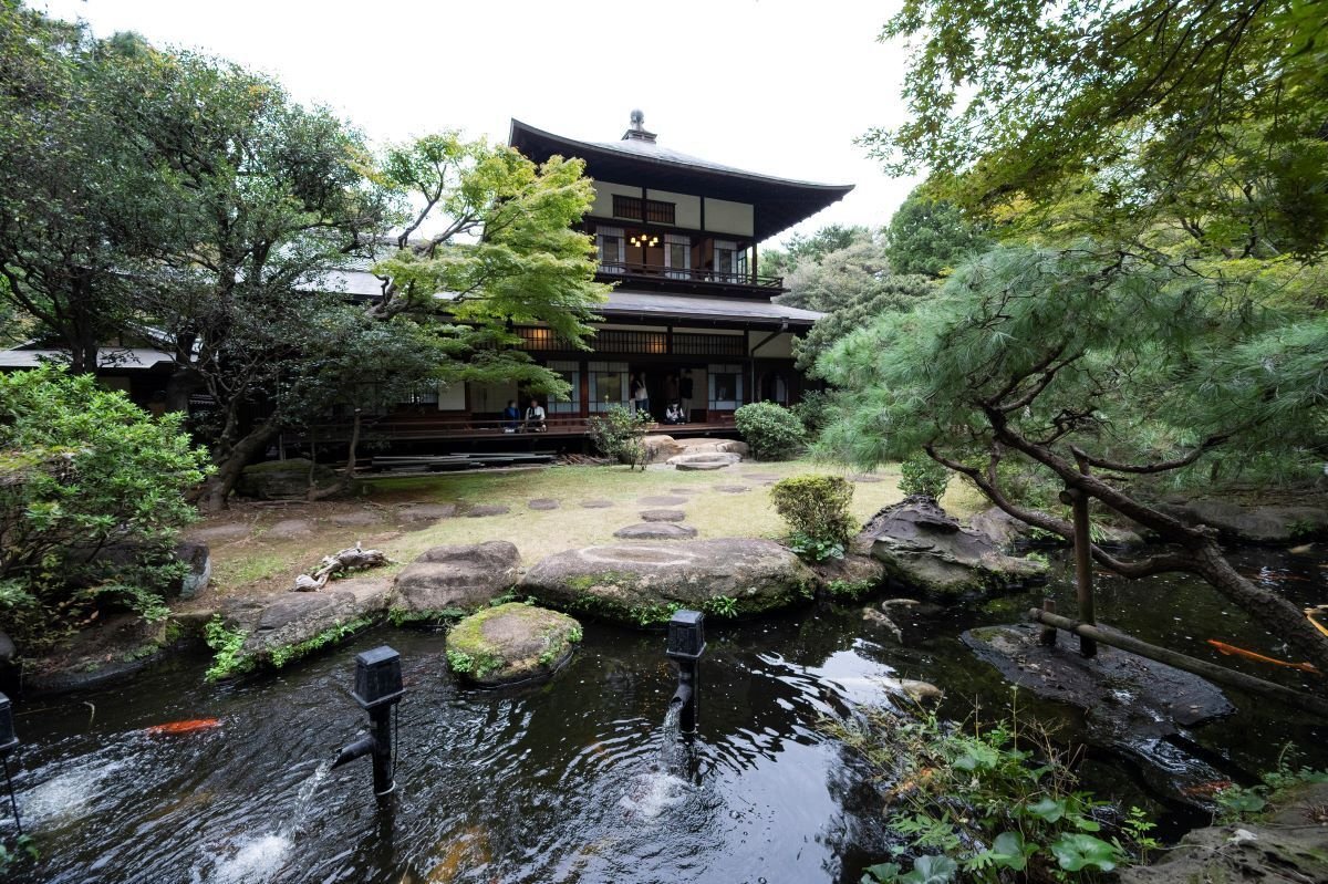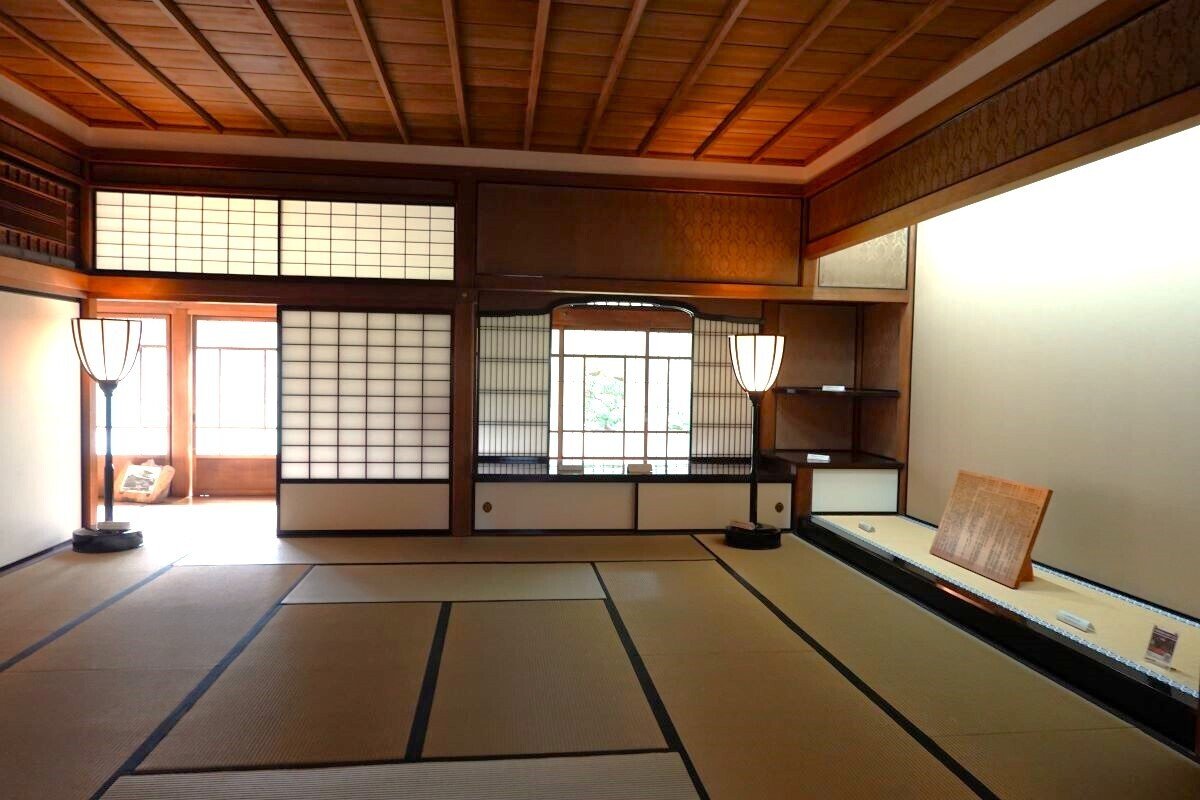 洋館から渡り廊下でつながっている和館は主に来客用、特に外国からのお客様をもてなした空間です。純和風の造りで、趣のある日本庭園には大きな石灯篭や人工の滝、池には優雅に鯉が泳いでいます(が、当時は来客の時だけ水を入れていたそうです)。