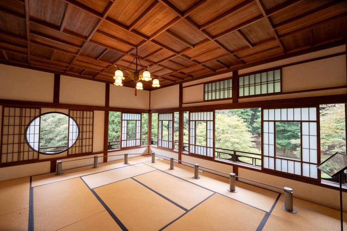 2階は数寄屋風のお部屋。障子に四角や丸に切り取られた窓があり、外の風景を眺めることができるという風流な作りです。