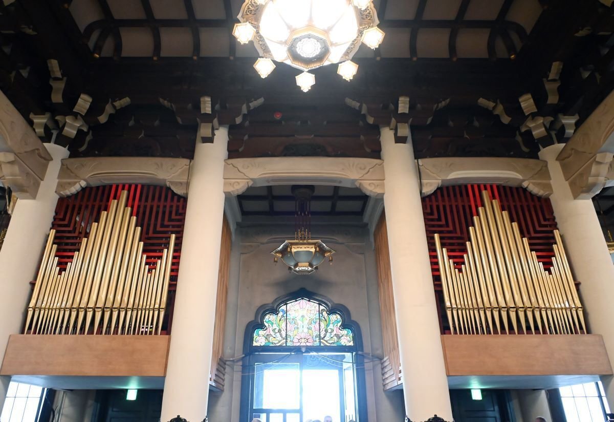そして後ろを振り返ると、上部に見えるのはパイプオルガン。お寺にパイプオルガン?と意外に思いますが、この高い天井と相まって、厳かで豊かな響きを楽しむことができます。