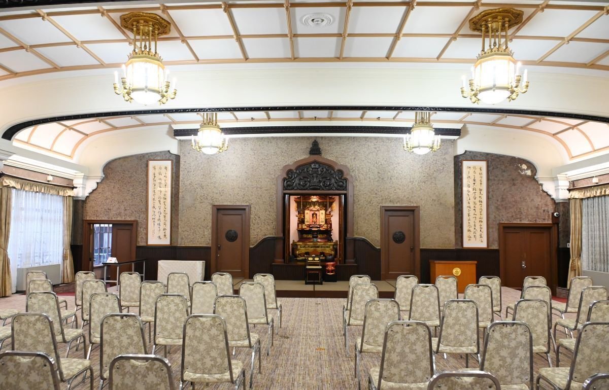 通常非公開の議場(現講堂)は、法事やイベントなど、特別な時にだけ使用される部屋。もともと議場として作られていて、正面に向かって半円状にテーブルと椅子が並び、すり鉢状になっていたそうです。