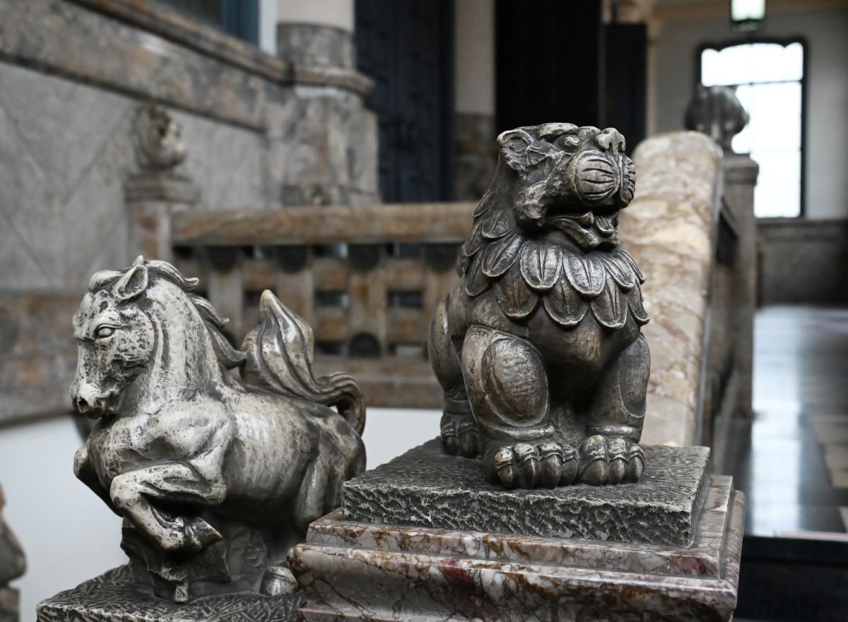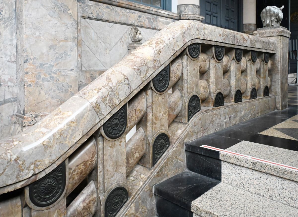 階段の装飾になっている円形のレリーフも、よく見ると1つずつ模様が違うことに気づきます。細部に隠れた建築家のこだわりに注目。