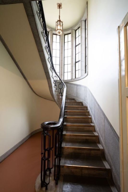 1階と2階をつなぐ階段と窓が織りなす空間は必見。階段の角度や手すりの先のくるくるとした形、この時代ならではの曲線美にうっとりします。