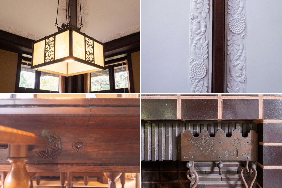 鶴をデザインした照明や船底天井のレリーフには鳥やリスなどの動物が見えています。家具にハート形のマークが施されていたり、暖炉の道具をかけるフックに南国のような絵が描かれていたりと、遊び心も満載。