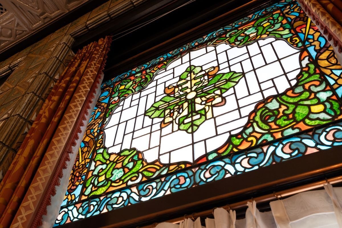 ステンドグラスのデザインも、柏の葉と壽の文字(寿の旧字体)がモチーフになっています。左右には、この青淵文庫をプレゼントした竜門社(現在の公益財団法人渋沢栄一記念財団)の名にちなんで、昇り竜・降り竜が囲んで見守っています。
