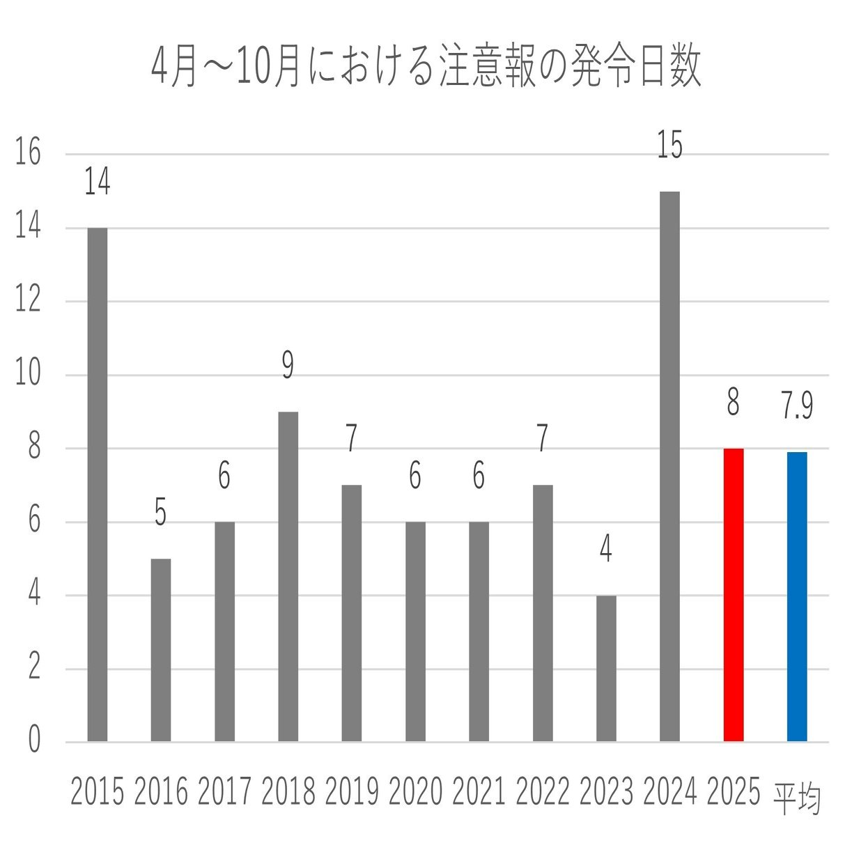東京都では、光化学オキシダントの濃度が発令基準以上になった場合に、光化学スモッグ注意報等を発令しています。4月~10月における光化学スモッグ注意報発令日数は減少傾向にありましたが、2024年に15件と増加し、2025年は8日と過去10年間の平均発令日数7.9日と同程度でした。