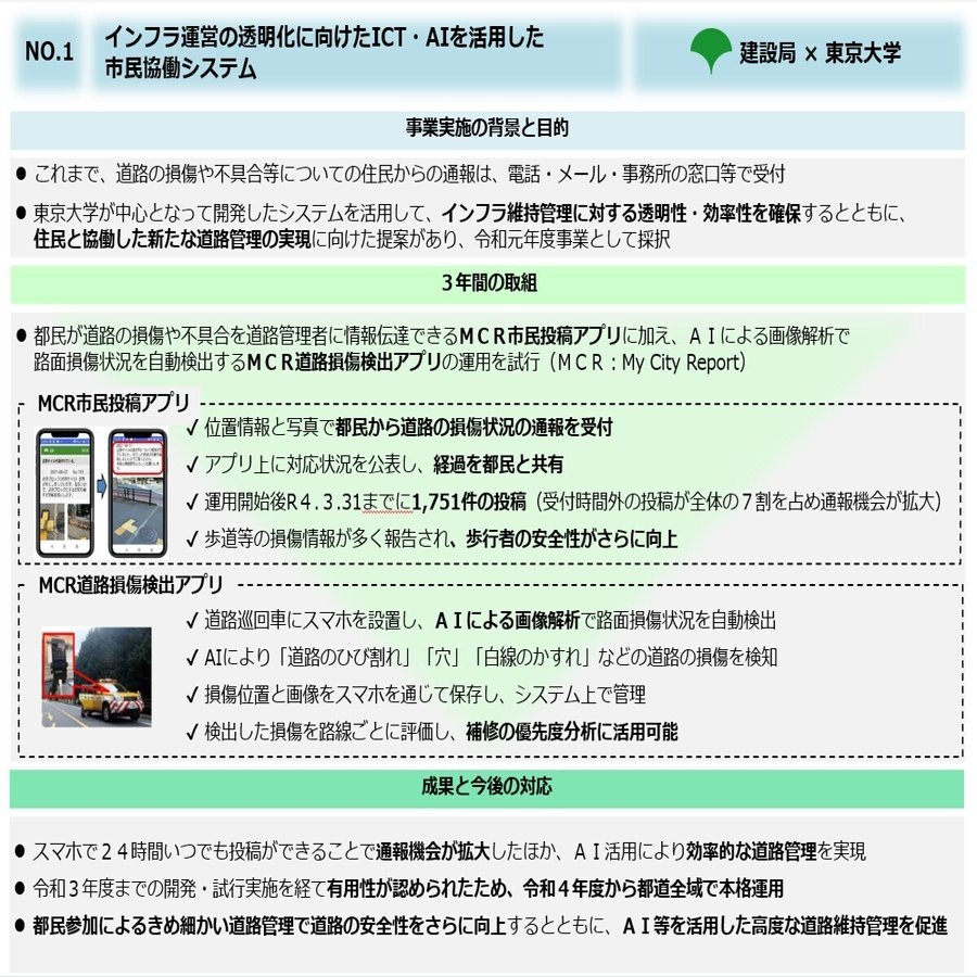 その結果、3年間の取組でMCR for Citizenは1751件の投稿があり、MCR for Road Managerも多くの道路損傷画像が蓄積され、補修の優先度分析等に活用され、翌年の令和4年度からは都道での全域展開に至るとともに、いくつかの都下の自治体でも本格運用となりました。