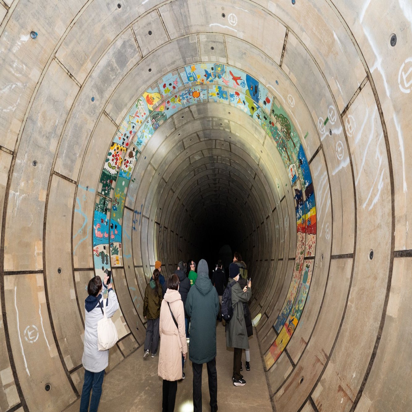 少し進むと、突然カラフルな壁が出現。これは地元の小学生が地上で描いた絵をトンネル建設時に貼り付けたものだそうです。普段メンテナンスをしている方も、これを見て心を和ませているのでしょうか。