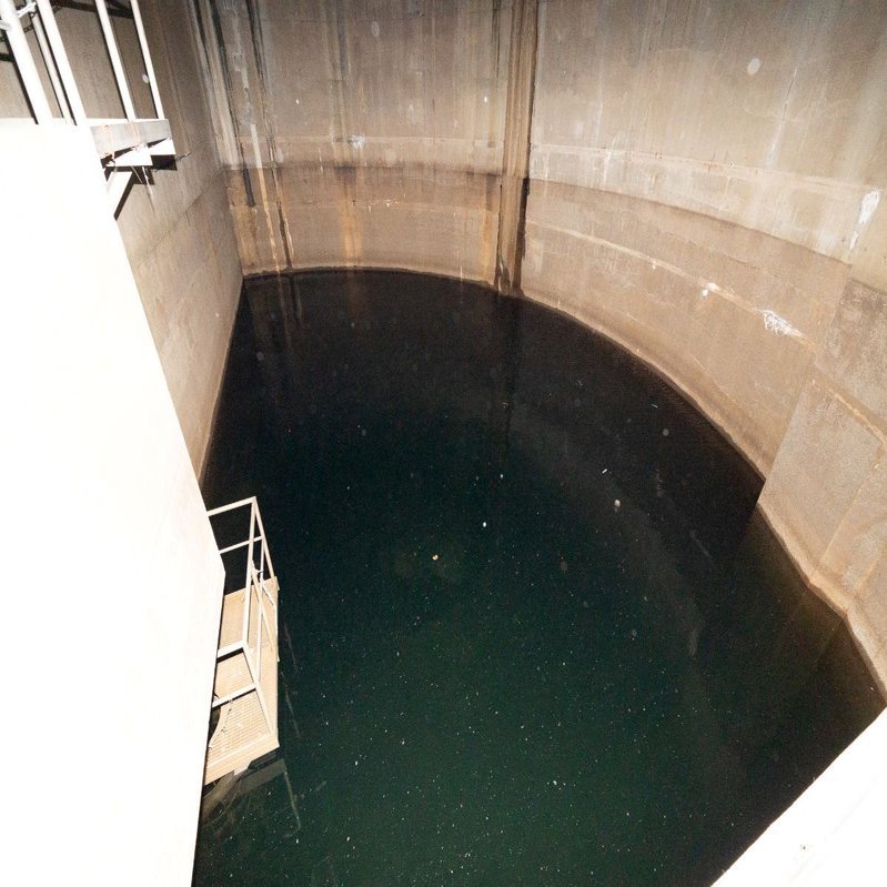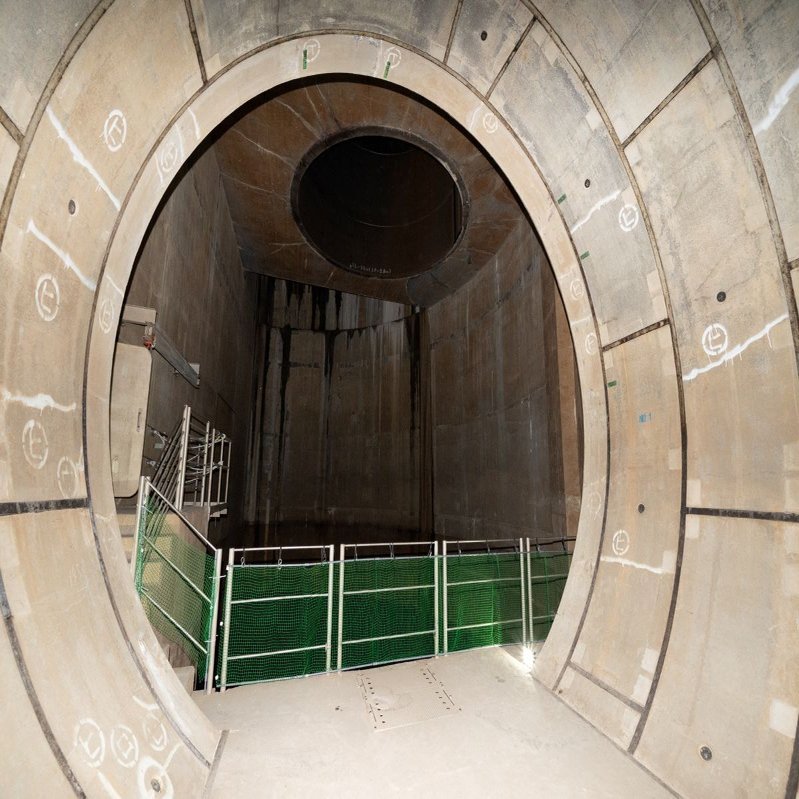 重厚な扉をくぐると、急にひんやりとした空気に包まれて、巨大な穴が垂直に貫いているのが見えます。ここは減勢池(げんせいち)と呼ばれる部分で、水たまりにすることで川から大量に落ちてくる水の勢いを抑えるのだそう。また、施設が住宅地にあるため、取り込んだ水をトルネード状に落とすことで、水が落ちる際の振動や音を軽減する仕組みになっています。