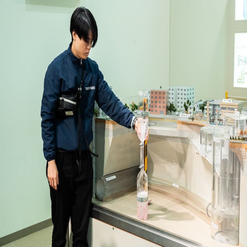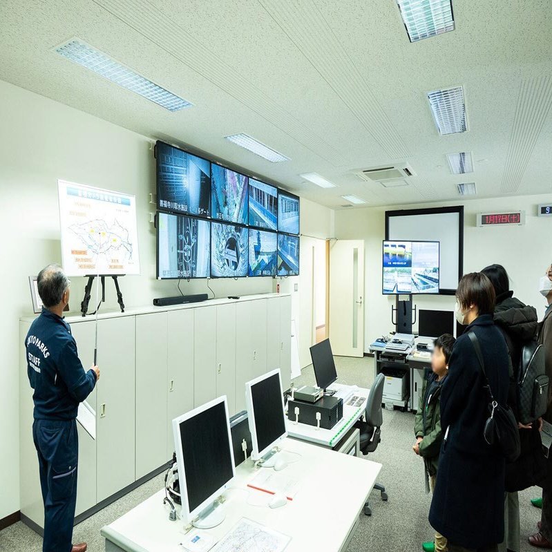 スタートとなる会場は、善福寺川と環七が交わる場所のすぐ近くに建てられている「善福寺川取水施設」。この回のツアー参加者は28名、大人の社会科見学といった内容ですが、親子連れの姿も多くみられました。まずはガイダンスで説明動画を視聴し、模型を使った解説や操作室の見学で調節池の役割や仕組みについて学びます。