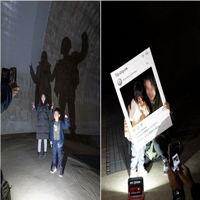 ここからはしばしお遊びタイム。トンネルのカーブを利用してユニークな影絵を作ったり、インスタグラムならぬイケスタグラムの枠で撮影をしたり、こだまが返ってくるやまびこ体験をしたりと、暗闇とカーブが作り出すトンネル空間を活かした遊びを体験しました。