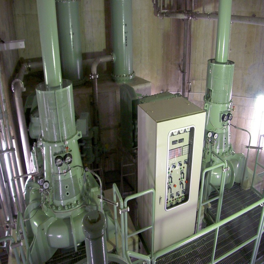 調節池があるのは地下43m、一般的なマンション14階相当になる222段の階段を延々と下りていきます。そこにはポンプが2台設置されていて、調節池で取水した後、河川の水位が下がったら、水をポンプでくみ上げて川に戻す役割があります。