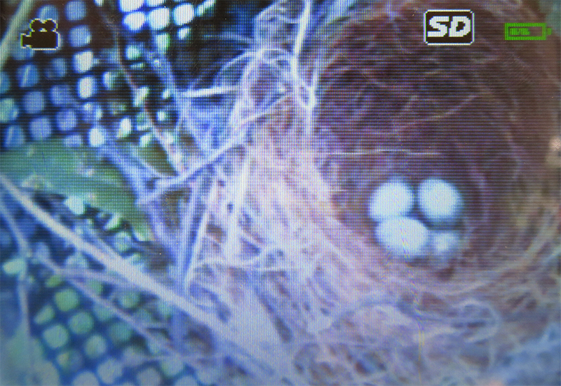 巣が完成してから5日経ったころ、どんな巣ができているのか確かめるためにスコープカメラ(細長いケーブルの先端にレンズのついた小型カメラ)を使って巣を覗いてみました。すると、巣には4つの卵が産み落とされていました。さらに、その2日後にはメスが巣の上に座り、卵を温め始めたのです。