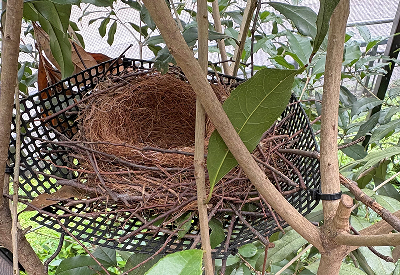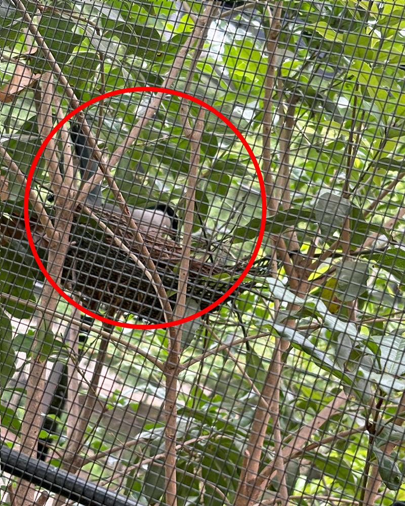 結果は残念でしたが、今回オナガたちは写真のような野生の巣に近い立派な巣を作り上げ、巣の中で産卵し、3つの卵を割らずに抱くことができました。2023年から少しずつ環境を整え、課題を乗り越えてここまでの巣を2羽が作ったことは、提供した環境が間違えていなかったのだと今回の巣作りを見て自信をもつことができました。