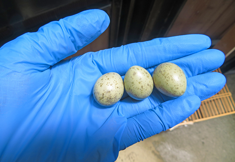 20日後に巣の中を確認しました。最初に4卵あった卵は、原因はわかりませんが3卵に減っていました。回収した卵のうち2卵は有精卵でしたが、残念ながら途中で発生が止まっていました。給餌や個体の確認など職員が必要な作業をおこなっていても、オナガが安心して卵を抱いていられる環境作りが次なる課題となりました。