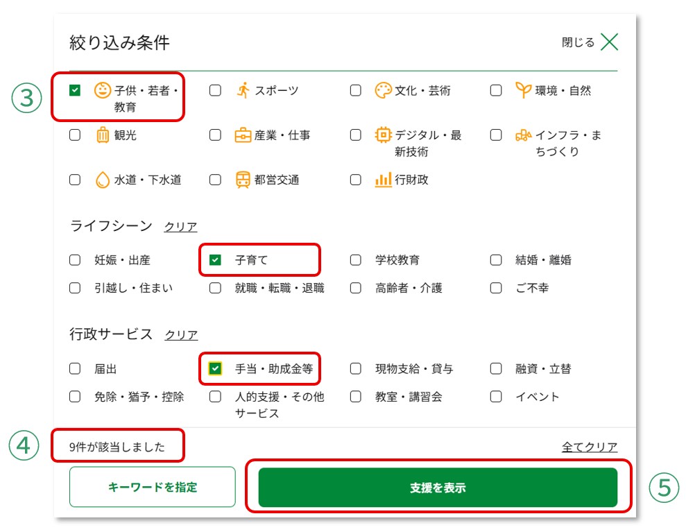 具体的な支援策を知らなくても、カテゴリやライフシーンなどの条件をチェックしたり、キーワードを入力したりするだけで、あなたにぴったりの支援情報を簡単に検索できます。