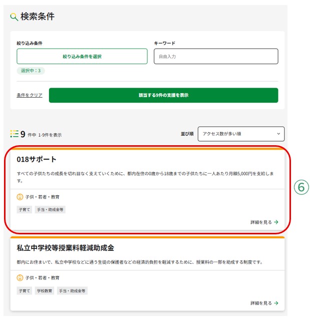 - ⑥ 詳しく見たい支援策を押下します。