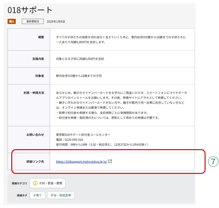 - ⑦ 内容を確認し、手続きをしたい又はより詳細な情報を知りたい場合には、詳細リンク先ページ(外部サイト)をご確認ください。
