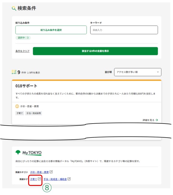 - ⑧ 関連するカテゴリやタグを押下すると、MyTOKYOの最新記事の一覧に遷移します。支援情報以外の都の関連記事もチェックすることができます。