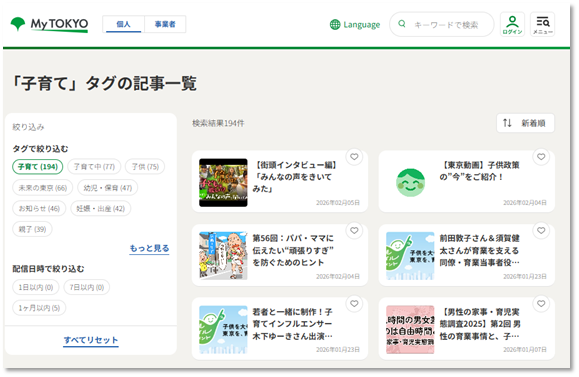 MyTOKYOでは新着記事を、Tokyo支援ナビでは支援情報をカテゴリやタグでそれぞれ探すことができるようになっています。