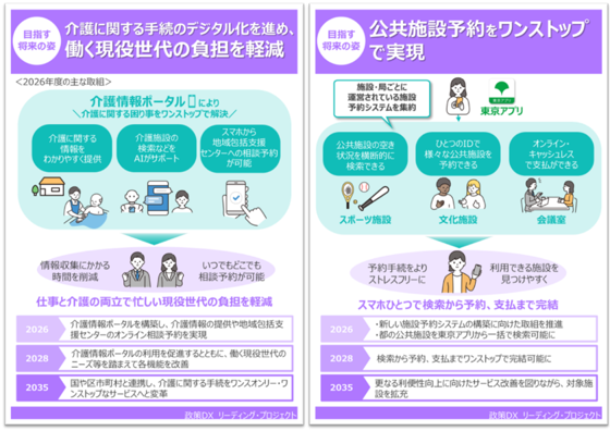 組織や分野の壁を越えた「政策DX」の取組については、介護に関する手続のデジタル化や公共施設予約をワンストップで実現する取組など、都民の皆様の負担が軽減され、より使いやすい行政サービスを実現する取組を開始しています。