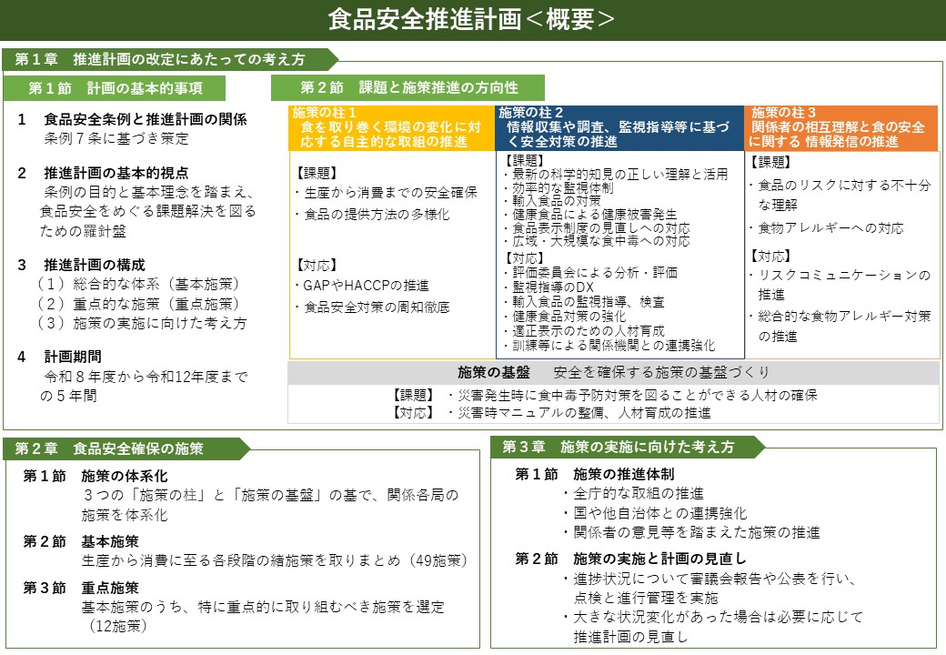 東京都では、食品安全条例に基づき「東京都食品安全推進計画」を策定し、総合的・計画的に食品の安全確保に関する施策を進めています。この度、食品安全条例の基本理念のもと、推進計画に基づき取り組んできた全庁的な施策の継続を基本としつつ、令和3年以降に生じた食品安全をめぐる課題を整理し、都における食品の安全確保に関する施策をより一層推進していくため、推進計画を改定しました。