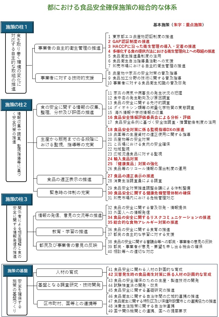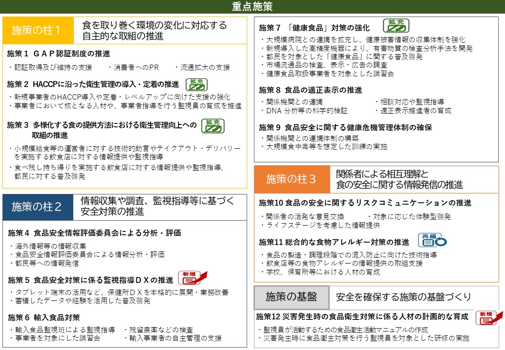 これまでの取組を継続する必要のある課題に加え、災害時の食品衛生対策などの新たな課題にも対応するため「3つの施策の柱と施策の基盤」のもとで都が推進する食品安全確保施策を「基本施策」として整理しました。